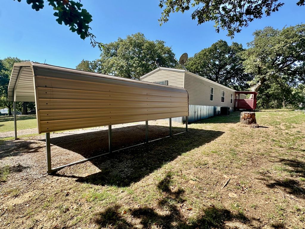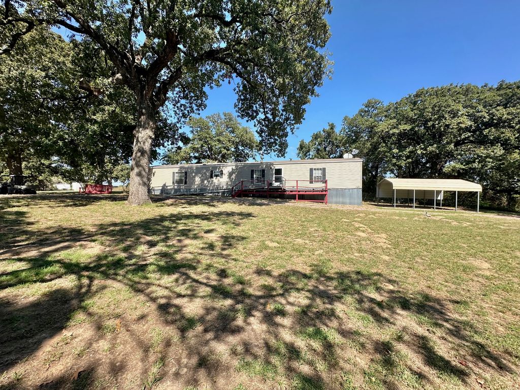 Lake Texoma Home sitting on 4 spacious acres! This property checks several boxes. Home sits on the hilltop boasts 3 bedrooms, 2 full bathrooms, has open floor plan, handicap ramp access at the front and covered back patio. Secure double gated entry with circle drive. Storm cellar and 2 car carport. Rural and Well water. 30x40 Metal Shop Building fully equipped with HVAC system, full bathroom, and full length covered attached awning. West section of the property is wooded with an abundance of wildlife and seasonal creek. Come check out all the opportunities this property has to offer!