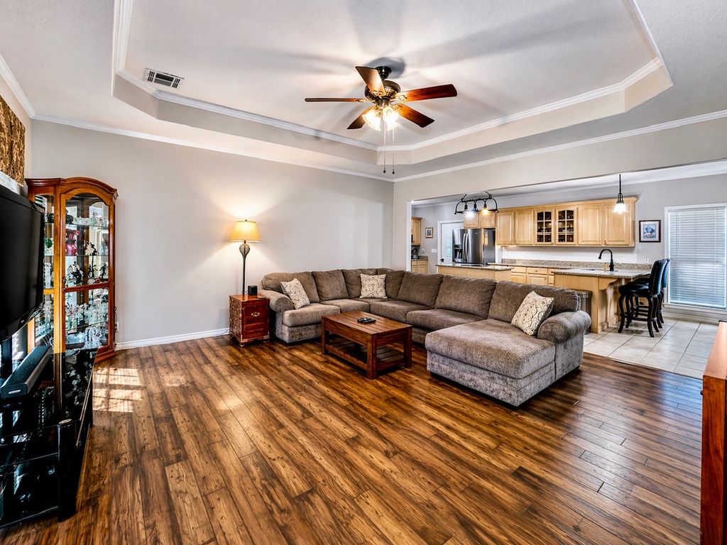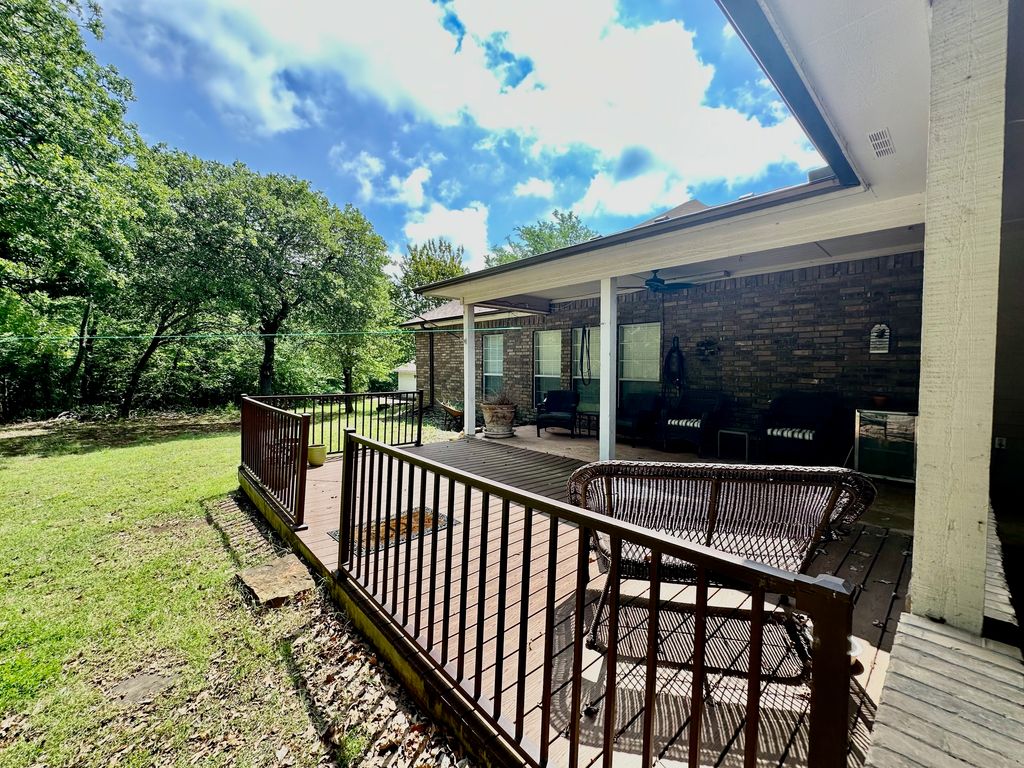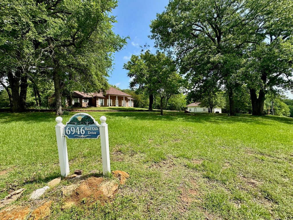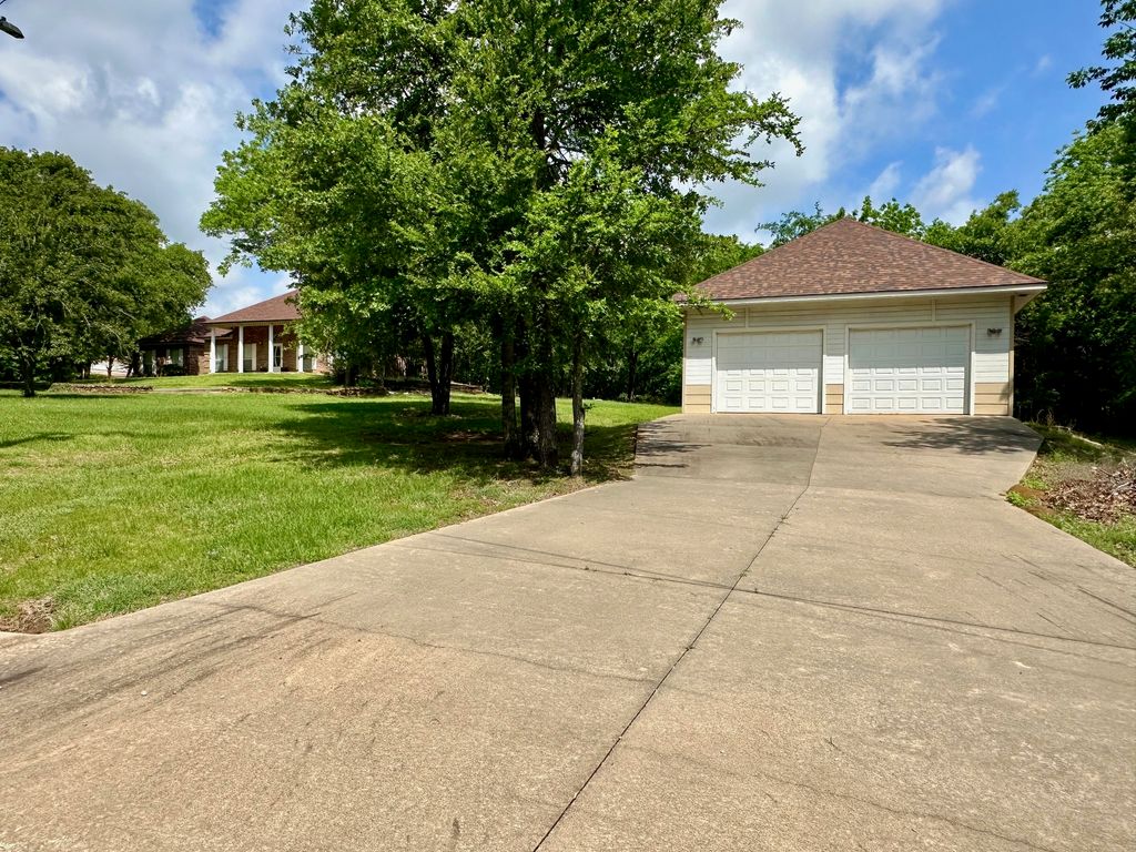 Stately Colonial-style brick home situated on five corner lots in the gated lake community of Oak Ridge. This well-maintained property features an open-concept layout with spacious living, kitchen, and formal dining areas—perfect for both everyday living and entertaining. All bedrooms are generously sized and offer access to full bathrooms, while the primary suite includes a large walk-in closet. Enjoy outdoor living with covered front and back patios, plus ample parking with a three-bay covered carport featuring electric overhead doors. Additional highlights include concrete driveways, a storage building with dedicated workshop space, and plenty of room to spread out. Conveniently located just minutes from Chickasaw Pointe Golf Club, West Bay Casino, Catfish Bay Marina, and the upcoming Hard Rock Hotel & Casino Lake Texoma.