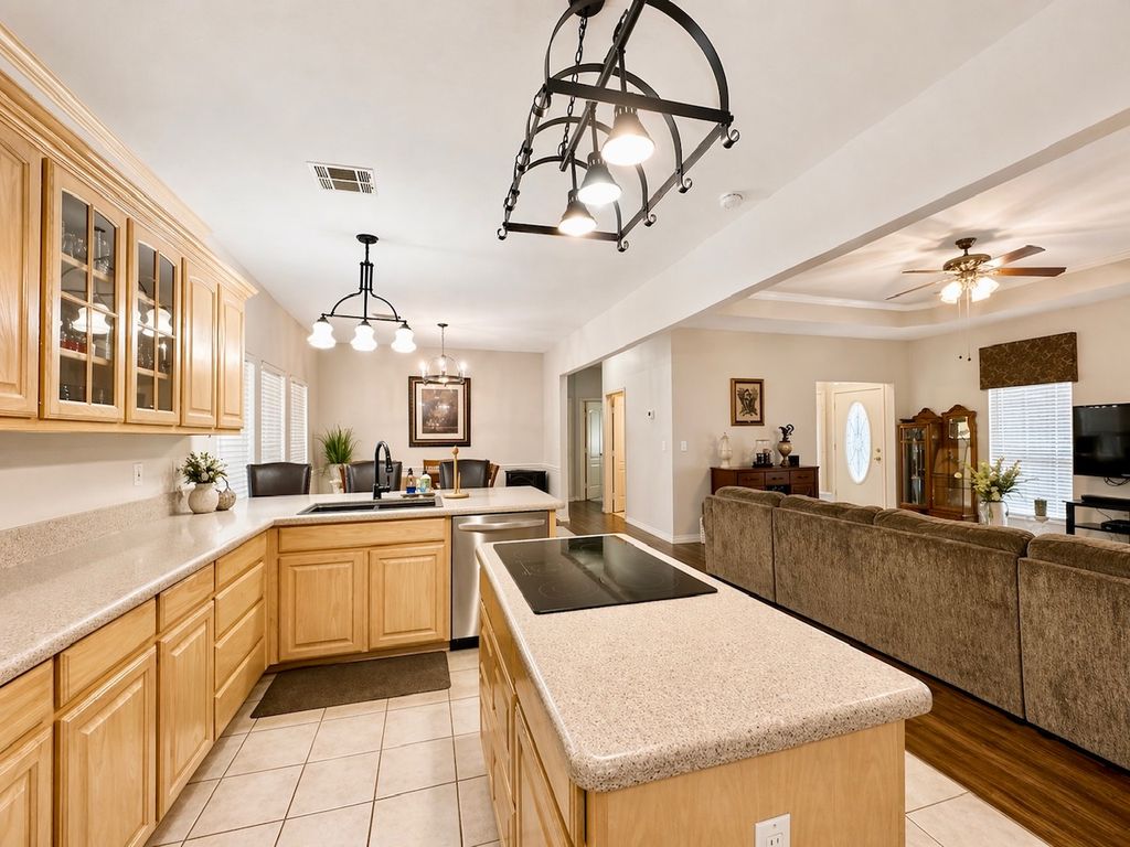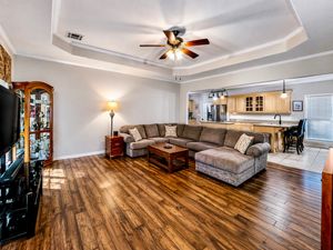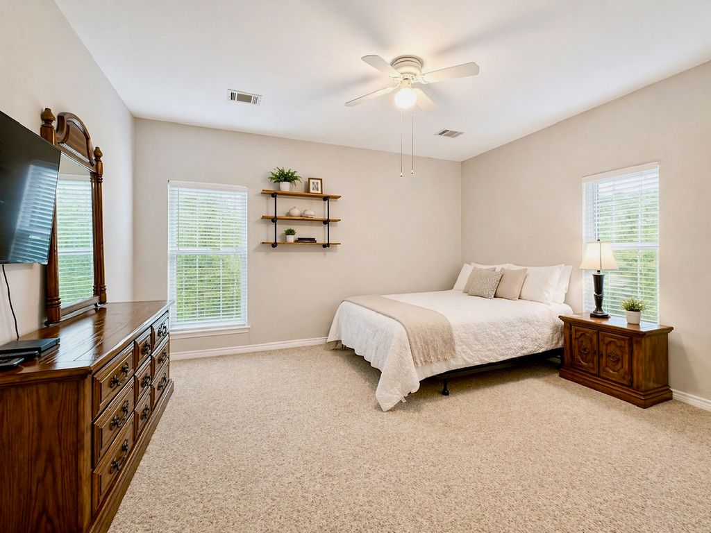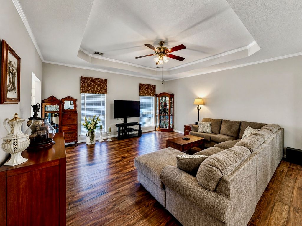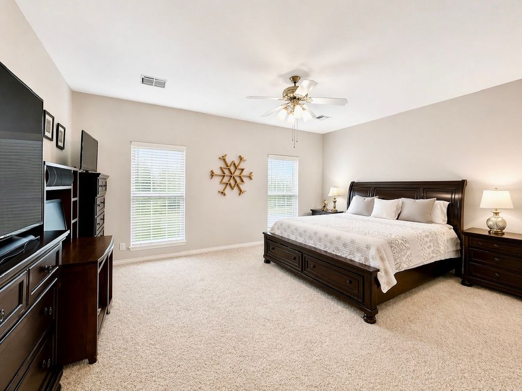 Stately Colonial-style brick home situated on five corner lots in the gated lake community of Oak Ridge. This well-maintained property features an open-concept layout with spacious living, kitchen, and formal dining areas—perfect for both everyday living and entertaining. All bedrooms are generously sized and offer access to full bathrooms, while the primary suite includes a large walk-in closet. Enjoy outdoor living with covered front and back patios, plus ample parking with a three-bay covered carport featuring electric overhead doors. Additional highlights include concrete driveways, a storage building with dedicated workshop space, and plenty of room to spread out. Conveniently located just minutes from Chickasaw Pointe Golf Club, West Bay Casino, Catfish Bay Marina, and the upcoming Hard Rock Hotel & Casino Lake Texoma.